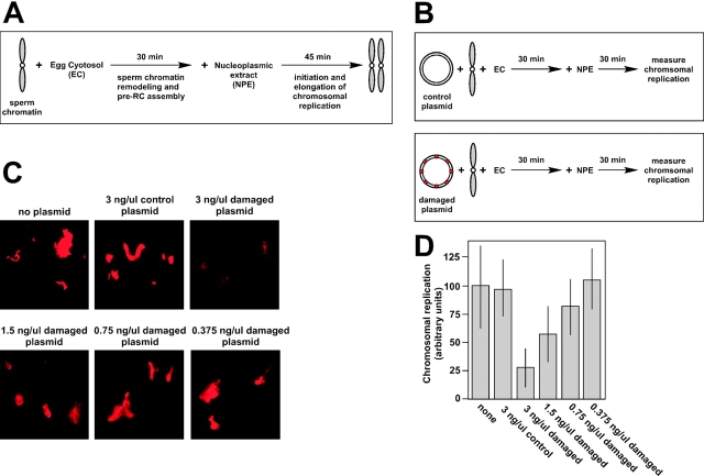 Figure 1. Dose-dependent inhibition of sperm chromatin replication by MMS-treated plasmid DNA. (A) Schematic depiction of the NPE DNA replication system. See Results for details. (B) Experimental design. Either control, undamaged plasmid DNA, or MMS-treated, damaged plasmid DNA, was coincubated in the NPE system with sperm chromatin. Replication of the sperm chromatin templates was then assessed. (C) The indicated amount of plasmid DNA was mixed with sperm chromatin, which was present at a final concentration of 2,000/μl in all samples. After incubation in egg cytosol for 30 min, NPE containing bio-dUTP was added and incubation was continued for an additional 30 min. The samples were fixed and stained with Texas red–labeled streptavidin, according to established procedures (Stokes et al., 2002), and viewed under a fluorescence microscope. The relative fluorescent intensity of each sample is an indicator of the efficiency of DNA replication. (D) Quantification of the data shown in C was achieved through measurement of the fluorescent intensity of 50 individual sperm chromatin templates for each experiment, using the Scion Image software package from images obtained from a fluorescent microscope attached to a Spot camera. The bars represent mean averages for each experiment, and the error bars refer to one SD from that mean. |