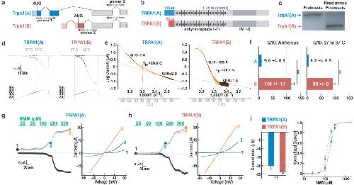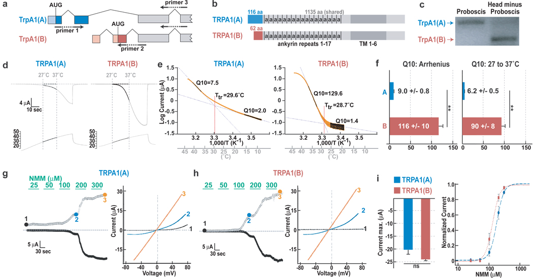 TrpA1 gene structure and primer locations. b, Red and blue boxes denote isoform-specific sequences. a, ankyrin repeat. Dark grey, transmembrane region. c, RT-PCR. d–e, TRPA1(A)- and TRPA1(B)-dependent currents (d) and Arrhenius plots (e) in oocytes. f, Q10s from Arrhenius plot (left) or 27–37°C (right). g, h,