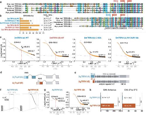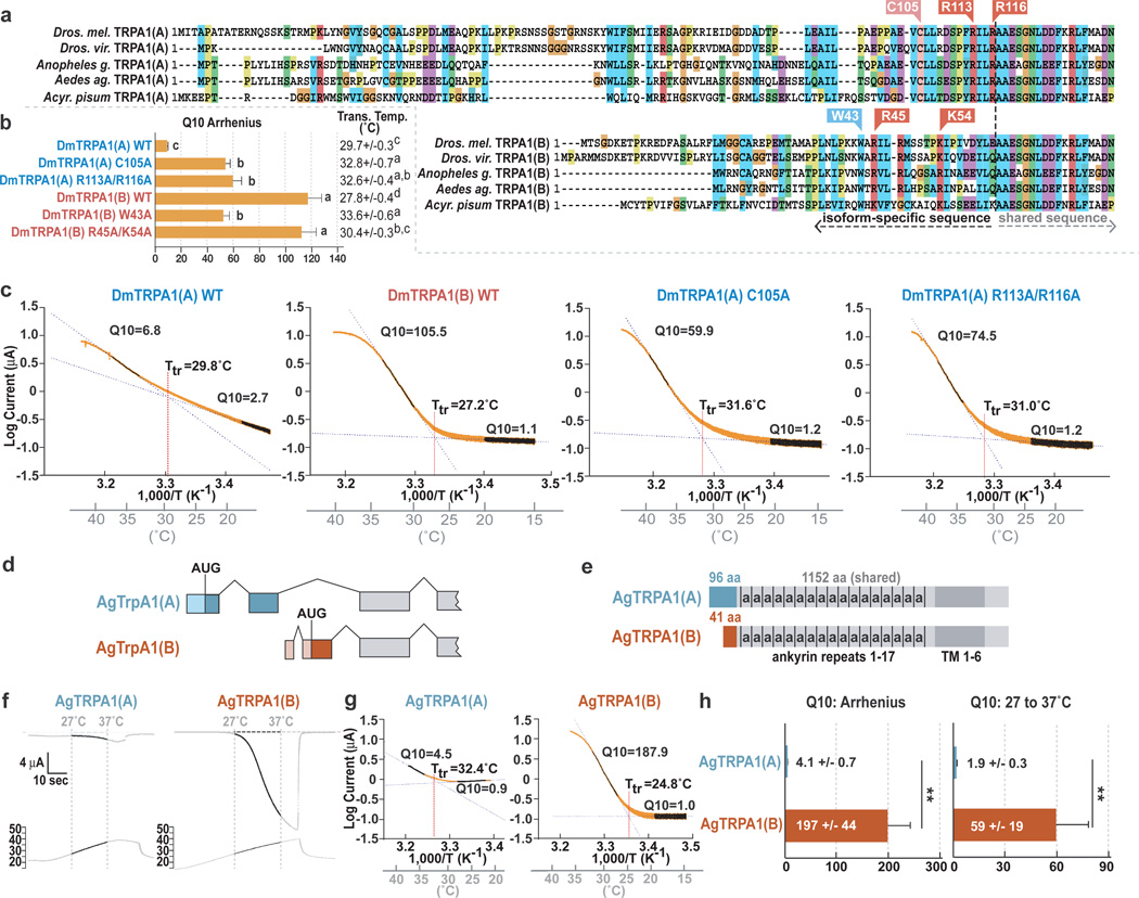 Figure 4. Regulation of insect TRPA1 thermosensitivity by alternative N-terminia, TRPA1 sequence alignments. b, Q10 and transition temperatures of wild type and mutant TRPA1s. Letters denote statistically distinct groups (Tukey HSD, α = 0.02). c, Arrhenius plots of indicated channels. d,