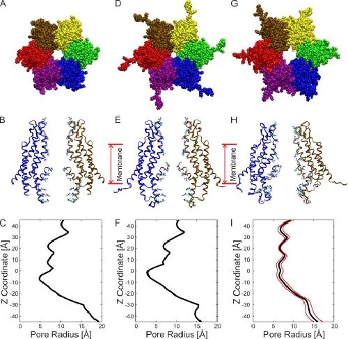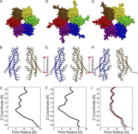 Figure 1. Structural models and pore dimensions of Cx26 hemichannels. (A) Top view of the Cx26 hemichannel corresponding to the crystal structure (Protein Data Bank accession no. 2ZW3; Maeda et al., 2009). The six protein subunits, depicted in different colors, surround a central aqueous pore. (B) Side view of the structure shown in A, illustrating the TM architecture and channel pore relative to two opposite subunits. The extracellular entrance of the channel (z = 45 Å) is at the top of the structure. (C) Pore radius of the Cx26 “crystal” hemichannel determined by HOLE plotted as a function of the z coordinate. (D) Top view of the “completed” crystal structure including the atomic coordinates of the N-terminal methionine residue (Met1), the side chains of K15, S17, and S19, as well as residues comprising the CL and the C terminus. (E) Side view of the completed crystal structure, showing the same subunits as in B. (F) Pore radius of the completed crystal structure. (G) Top view of the channel conformation that has the smallest RMSD from the average equilibrated structure, average pore dimension, and pore-lining probability. We define this structure as the “average equilibrated structure.” (H) Side view of the average equilibrated structure. (I) Pore dimensions of the average equilibrated structure. The mean pore radius is depicted by the black line. The red lines represent the dynamic variation by plotting the mean ± the standard deviation determined from the four 20-ns production-phase simulations.