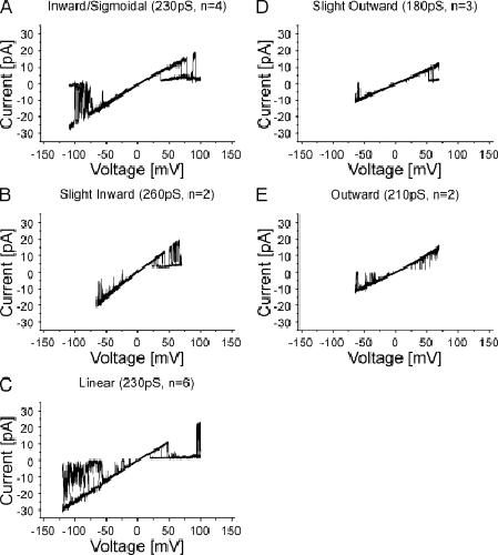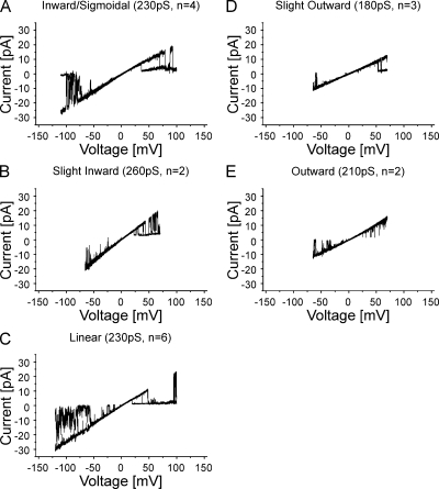 Figure 3. Heterogeneity of I-V relations observed for human Cx26 undocked hemichannels in Xenopus oocytes obtained with outside-out patch-clamp recordings in 100 mM of symmetric KCl. Five I-V relations ranging from slight inward to slight outward are illustrated. (A) Inward/sigmoidal I-V relation obtained with a ±150-mV voltage ramp. 2 of 10 sequential current traces from one record are superimposed. Current traces from −110 to 100 mV show the open-channel I-V relation. (B) Slightly inward I-V relation obtained with a ±70-mV voltage ramp. 3 of 10 sequential traces are superimposed. (C) Linear I-V relation obtained with a ±150-mV voltage ramp. 2 of 10 sequential current traces are superimposed. Current traces are shown from −125 to 100 mV. (D) Slightly outward I-V relation obtained with a ±70-mV voltage ramp. 2 of 10 sequential current traces are superimposed. (E) Outward I-V relation obtained with a ±70-mV voltage ramp. 2 of 10 sequential current traces are superimposed. In all cases, the single-channel records display both forms of voltage-dependent gating reported for Cx26 undocked hemichannels (González et al., 2006; Sánchez et al., 2010). Loop- or slow-gating transitions that can result in full channel closure were observed at large inside negative potentials, and Vj- or fast-gating transitions that result in closure to subconductance states were observed at inside positive potentials. These events correspond to the upward current deflections from the fully open state at negative potentials and downward deflections from the fully open state at positive potentials, respectively, in the records shown. Full channel closures at negative potentials were used to subtract leak conductance in single-channel records.