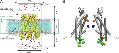 Figure 4. (A) Schematic representation of the GCMC/BD system for Cx26 hemichannels. A Cx26 hemichannel (yellow) inserted into the explicit POPC membrane system was integrated into the implicit membrane system of the GCMC/BD program to ensure a tight seal between the irregular conical surface of the Cx26 channel and the implicit membrane. The boundaries of the implicit and explicit membranes are indicated by the dotted green lines. The simulation box (66 × 66 × 120 Å) was separated by the channel/membrane into two compartments, each containing 100 mM KCl. The buffer region maintains the chemical potential in the two compartments by creating and destroying ions with a GCMC algorithm. The upper compartment (extracellular part of the channel) was defined as the ground in voltage applications. 20 replicate 450-ns simulations were performed at each of seven voltages, ±150, ±100, ±50, and 0 mV, to plot the I-V relations. Blue circles, K+; red circles, Cl−. (B) Positions of modified residues identified by Locke et al. (2009) that would alter the distribution of charge in the Cx26 channel pore, shown in a side view of two opposite subunits of the completed crystal structure. The positions of acetylated residues are colored as follows: blue, Met1; red, K15; green, K102, K103, K105, K108, K112, and K116 in CL/TM2; orange, γ-carboxyglutamated residues E42, E47, and E114.