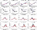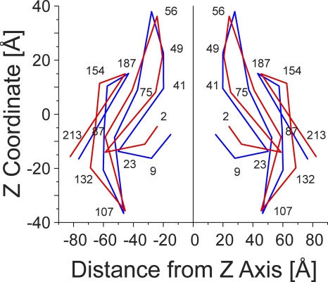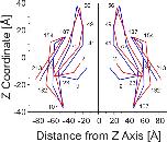 Figure 2. Skeleton drawings of selected portions of the crystal and average of all equilibrated structures to show gross changes resulting from structural equilibration by MD simulations. Superimposition of the skeleton of the crystal structure (blue) and the average of all equilibrated structures (red).