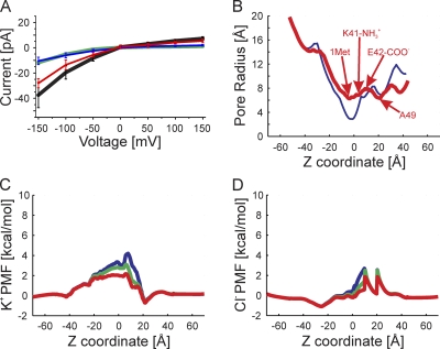 Figure 5. GCMC/BD simulations of the average equilibrated structure. (A) The I-V relation obtained computationally for the multi-ion case (100 mM of symmetric KCl). The black line is the total current, the red line is the Cl− current, the blue line is the K+ current, and the green line is the total current of the completed crystal structure corresponding to Fig. S5 A. (B) The pore radius of the average equilibrated structure is shown in red, and the completed crystal structure is in blue. The positions of Cα of Met1, the amide group of K41, the carbonyl of E42, and the Cα of A49 are indicated. (C) The PMF of K+ at three voltages, 150 mV (blue), 0 mV (green), and −150 mV (red), are plotted against the z coordinate. The blue, green, and red lines are the PMF determined at 150, 0, and −150 mV, respectively. (D) The PMF of Cl− determined from simulations at the same three voltages.