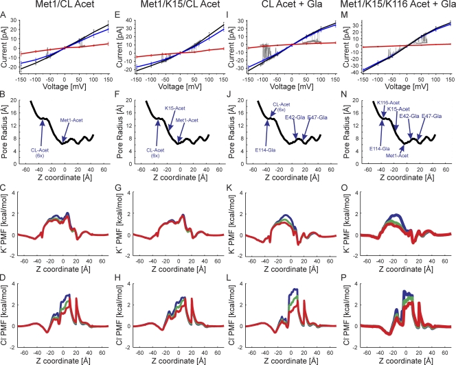 Figure 6. Superimposition of experimental I-V relations (gray traces) and those computed by GCMC/BD simulations with the charge effects of the indicated protein modifications. (A) The correspondence between slight outward rectification (Fig. 3 E) and simulated channel with neutralization of Met1 and six internal lysine residues in TM2/CL. The charge neutralizations mimic acetylation. The black line is the total current, the blue line is the K+ current, the red line is the Cl− current, and the gray line is the single-channel current trace. (B) The pore radius of the simulated channel structure plotted against the z coordinate. The positions of the modified atoms are shown. The six acetylated lysine residues at the tip of TM2/CL are grouped into one position and labeled “CL-Acet 6x.” (C) The PMF of K+ at three voltages, 150 mV (blue), 0 mV (green), and −150 mV (red), plotted against the z coordinate. (D) The PMF of Cl− determined at the same three voltages. (E–H) Outwardly rectifying experimental I-V relation corresponds to simulated I-V relations in which Met1, K15, and six lysine residues in TM2/CL are neutral-mimicking acetylation. (I–L) Inward sigmoidal experimental I-V relation corresponds to simulated I-V relations in which the six lysine residues in TM2/CL are neutralized (acetylated) and the three glutamate residues are modified by γ-carboxyglutamation (Gla). (M–P) Slightly inward rectifying experimental I-V relations correspond to simulated I-V relations in which Met1, K15, and K116 are neutralized (acetylated) and the three glutamate residues are modified by γ-carboxyglutamation (Gla).