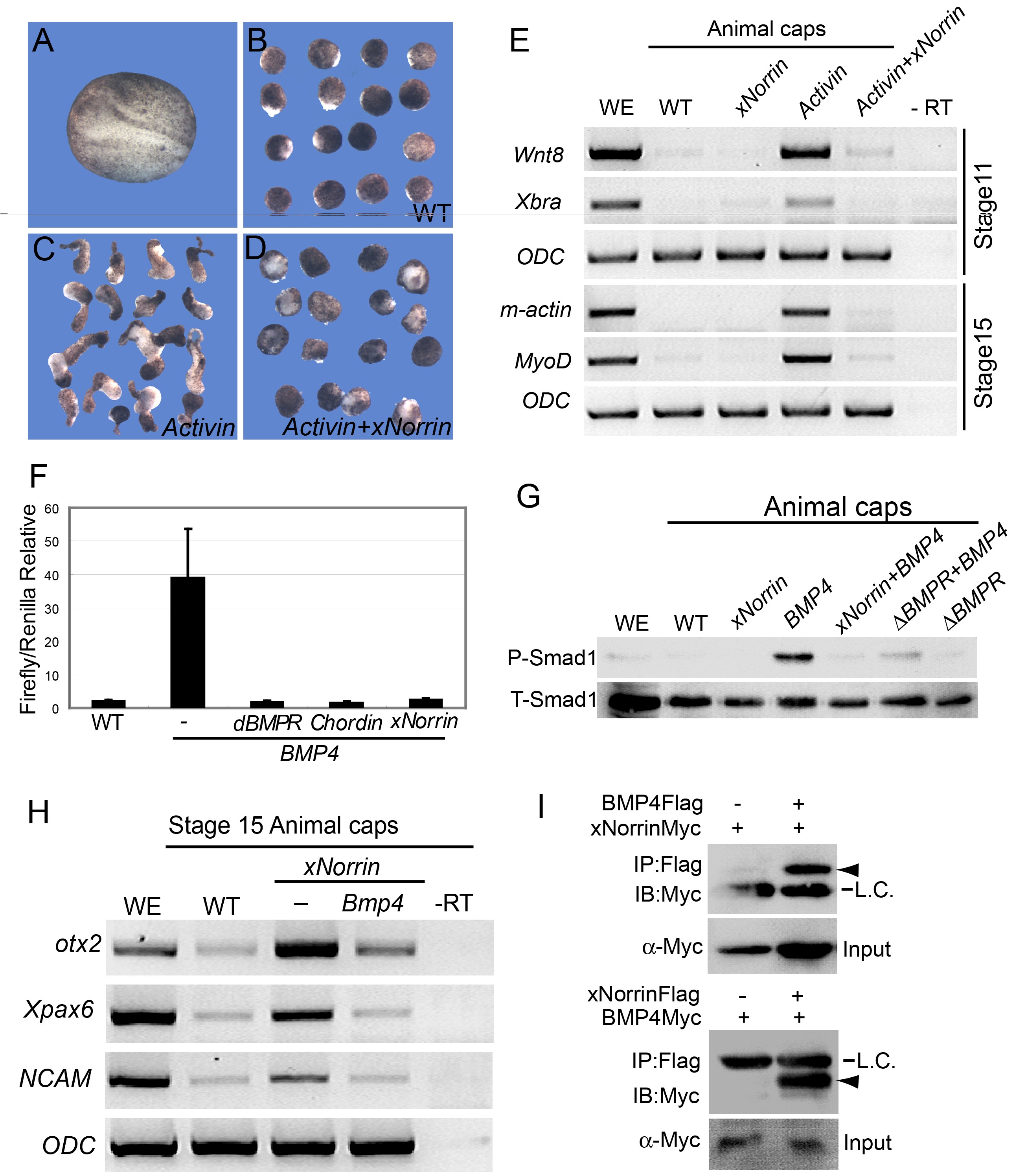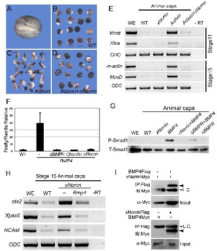 Figure 5. Reciprocal inhibition between xNorrin and TGF-β. (A-E) xNorrin inhibits Activin-B-mRNA-induced mesoderm formation. A wild-type (WT) embryo at a neurula stage (A). Wild-type animal caps with elongation (5% of the caps showed elongation, n = 60) (B). Elongated animal caps induced by Activin-B mRNA (25 pg) injection (82% of the injected caps showed elongation, n = 55) (C). Animal cap elongation was blocked in animal caps injected with Activin-B (25 pg) and xNorrin (200 pg) mRNAs (10% of the co-injected caps showed elongation, n = 58) (D). The Activin-B-mRNA-induced expression of mesoderm markers (Wnt8, Xbra, m-actin, and MyoD) was inhibited by xNorrin (E). RNAs were injected into the animal pole of one-cell embryos, and animal caps were cut around stage 8 and cultured in 1x MMR until the sibling embryos reached neurula stage. (F and G) xNorrin inhibits BMP4 signaling. xNorrin mRNA (500 pg), like δBMPR mRNA (200 pg) and Chordin mRNA (100 pg), inhibited BRE-Luc reporter activity in Xenopus embryos (F). xNorrin mRNA (500 pg) inhibited BMP4-induced Smad1 phosphorylation in animal caps (G). P-Smad1, phosphorylated Smad1; T-Smad1, total Smad1; WE, whole embryo. (H) BMP4 inhibited xNorrin-induced otx2, Xpax6, and NCAM RNA expression in animal caps of stage 15 embryos. -RT, no reverse transcription; WE, whole embryo; WT, wild-type animal caps. (I) xNorrin interacts with BMP4. BMP4-Flag and xNorrin-Myc mRNAs or xNorrin-Flag and BMP4-Myc mRNAs were injected into adjacent cells of four-cell embryos. FLAG-tagged proteins were immunoprecipitated (IP) from later gastrula embryos with a FLAG antibody. The proteins were PAGE separated and immunoblotted (IB) with an anti-c-Myc antibody. Arrowheads indicate xNorrin-Myc (top) or BMP4-Myc (bottom). L.C., IgG light chain. |