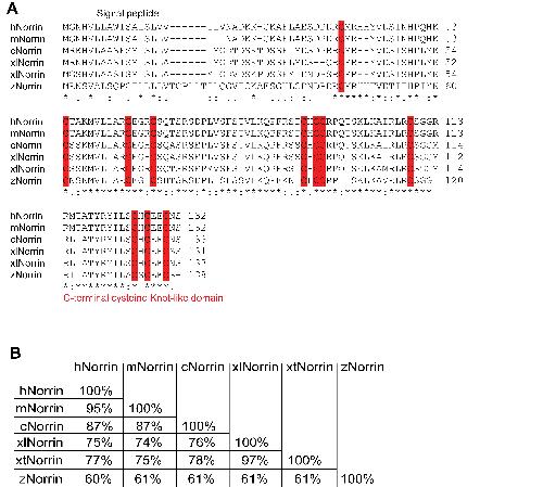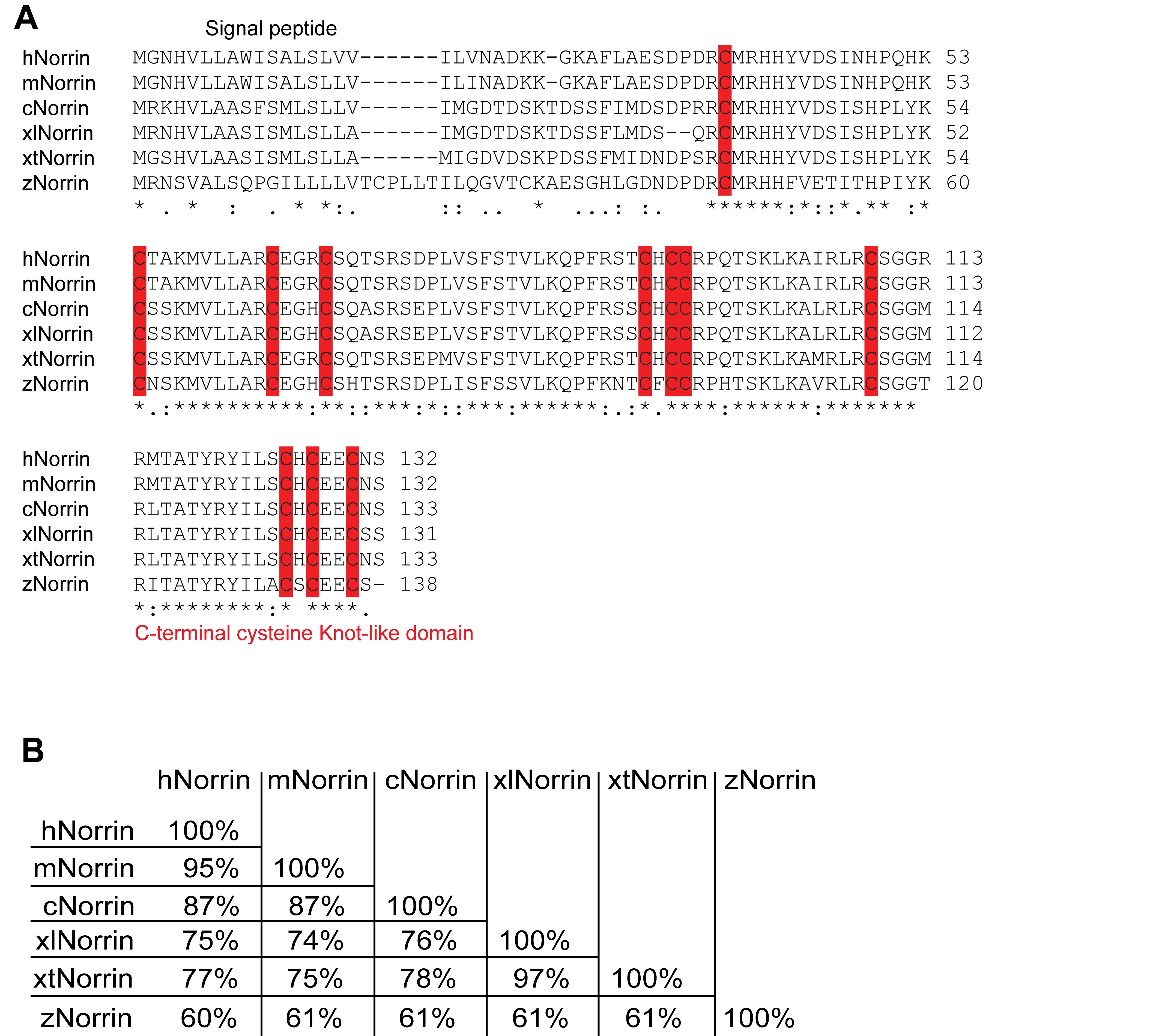 Figure S1. Norrins are highly conserved in vertebrates. (A) An alignment of Norrin protein sequences from selected vertebrate species. Prefixes used for Norrins from different species: human (h), mouse (m), chicken (c), X. laevis (xl), X. tropicalis (xt), and zebrafish (z). Conserved cysteine residues are highlighted in red. (B) Percentages of identical amino acid residues between Norrin proteins from different species. |