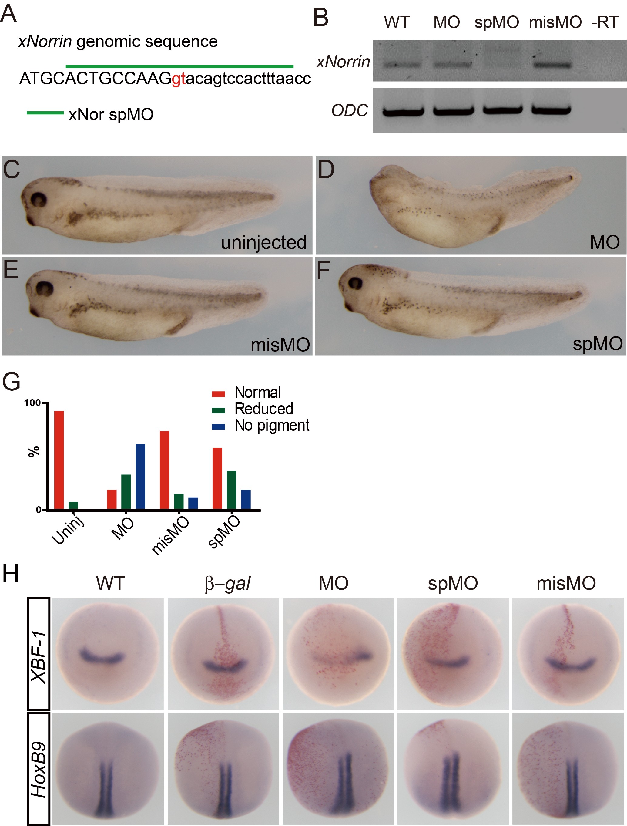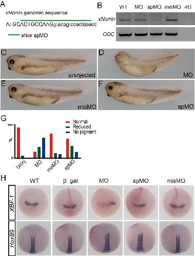 Figure S3. Maternal xNorrin is required for anterior neural formation. (A) The genomic sequence of the first exon and the first intron boundary of xNorrin. The first two presumptive nucleotides "gt" of the intron are labeled in red. The splicing site sequence targeted by xNor-spMO is indicated by a green line. See Materials and Methods for sequence information for all MOs. (B) RT-PCR to detect xNorrin mRNA expression in stage 15 embryos. xNor-spMO (20 ng) inhibited zygotic xNorrin transcription, while xNor-MO (20 ng) or xNor-misMO (20 ng) (a four-nucleotide mismatched MO compared to xNor-MO) did not. (C-F) Representative MO-injected tadpole at stage 34. xNo-spMO (20 ng) did not cause severe anterior defects, unlike xNor-MO. (G) Summary of (C-F). Uninjected: n = 30; MO: n = 24; misMO: n = 30; spMO: n = 40. (H) xNor-MO injection inhibited anterior neural formation. Whole-mount in situ hybridization was performed for XBF-1 mRNA (anterior neural marker) and HoxB9 mRNA (posterior neural marker) in stage 15 embryos. Dorsal animal cell injection of xNor-MO (10 ng) at the four- to eight-cell stage greatly reduced the expression of the anterior neural marker XBF-1 (63%, n = 32), while injection of xNor-misMO (10 ng) or xNor-spMO (10 ng) (27%, n = 29) was far less effective to reduce the expression. Neither xNor-MO (n = 25) nor xNor-spMO (n = 25) injection affected HoxB9 expression. MOs were co-injected with β-gal mRNA (100 pg). β-gal staining is shown in red. XBF-1 staining embryos are shown in anterior view, and HoxB9 staining embryos are shown in dorsal view, with the anterior pole at the top. misMO, xNor-misMO; MO, xNor-MO; spMO, xNor-spMO. |