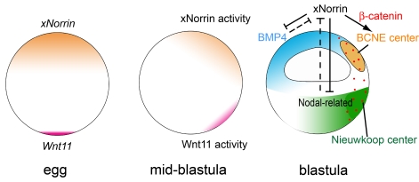 Figure 8. A model of dorsal specification in Xenopus.During oogenesis, maternal xNorrin and Wnt11 are localized to the animal and vegetal poles, respectively. After fertilization, both mRNAs are enriched at the dorsal side, leading to two localized activity domains: BCNE center and Nieuwkoop center. xNorrin in the dorsal animal cells helps to specify neuroectoderm fate by activating a Wnt/β-catenin signaling domain, the BCNE center, and also participates in antagonizing the Nodal-related signal from the vegetal half and the BMP signal from the ventral side. Wnt11 in the dorsal vegetal domain is required for β-catenin activation in all dorsal regions, including in the BCNE center. Yellow: xNorrin and BCNE center. Purple: Wnt11. Red dots indicate stabilized β-catenin. Green: Nieuwkoop center. |
