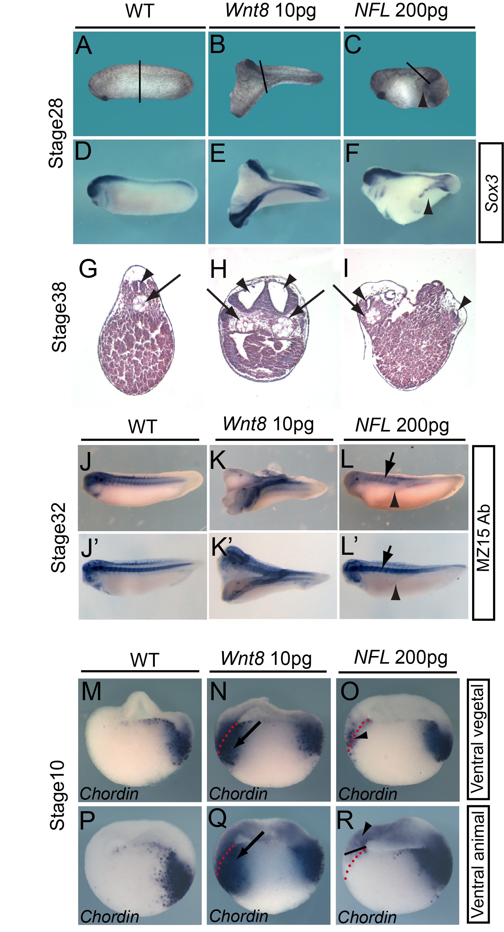 Figure 4. xNorrin activity is restricted to the ectoderm. (A-F) Injection of NFL into ventral vegetal cells at the eight-cell stage induced partial secondary axes. Wild-type (WT) embryos (stage 28) (A and D). Injection of Wnt8 mRNA (10 pg) into ventral vegetal cells in eight-cell embryos induces complete secondary axis formation (stage 28) (69% of injected embryos showed secondary axes, n = 85) (B and E). NFL mRNA (600 pg total; 200 pg each) co-injection of ventral vegetal cells in eight-cell embryos induces partial secondary axis formation (stage 28) (45% of co-injected embryos showed secondary axes, n = 105) (C and F). Whole-mount in situ hybridization for Sox3 in stage 28 embryos (D-F). Note that NFL induces Sox3 expression in the partial secondary axis (arrowhead in [F]). The black lines in (A-C) indicate the section planes in (G-I), respectively. (G-I) Histological sections of embryos at stage 30. A wild-type embryo (G). Wnt8 mRNA injection induced both secondary neural tube and notochord (H). NFL co-injection induced secondary neural tube but not notochord formation (I). Arrowhead: neural tube; arrow: notochord. (J-L) Immunostaining of notochords with the monoclonal antibody MZ15. Wild-type embryo with single notochord (all examined embryos) (J and J'). An embryo injected ventrally with Wnt8 mRNA (10 pg) showed two notochords (induced secondary notochord and the primary notochord) (all examined embryos with secondary axes) (K and K'). An embryo injected ventrally with NFL (200 pg each) showed only the primary notochord (arrows), with notochord tissue absent in the partial secondary axis (arrowheads) (all examined embryos with partial secondary axes) (L and L'). Embryos are at stage 30. (M-R) NFL and Wnt8 induced Chordin expression in different domains in the ventral cells. Whole-mount in situ hybridization was used to evaluate Chordin expression in stage 10 embryos. Chordin expression in wild-type early gastrula (M and P). Wnt8 mRNA (10 pg) injection into ventral vegetal cells induced Chordin expression both in the superficial layer and in the deep layer of the marginal zone (87.5% of injected embryos showed the expression in both layers, n = 24) (N). Injection of NFL mRNAs (200 pg each) into the same domain induced Chordin expression mainly in the superficial layer (76% of injected embryos showed the expression, n = 30) (O). Injection of Wnt8 into the ventral-animal cells of eight-cell embryos induced Chordin expression both in the ectoderm and in the mesoderm (84% of injected embryos showed the expression in both layers, n = 25) (Q). Injection of NFL mRNAs (200 pg each) into the same domain of eight-cell embryos induced Chordin expression only in the ectoderm (72% of injected embryos showed the expression, n = 32) (R). Arrowheads: superficial layer (O) or ventral ectoderm (R); arrows: deep layers on the ventral side. All embryos in (M-R) are shown with their dorsal sides to the right. Dotted lines delineate the superficial layer and deeper layer on the ventral side. |