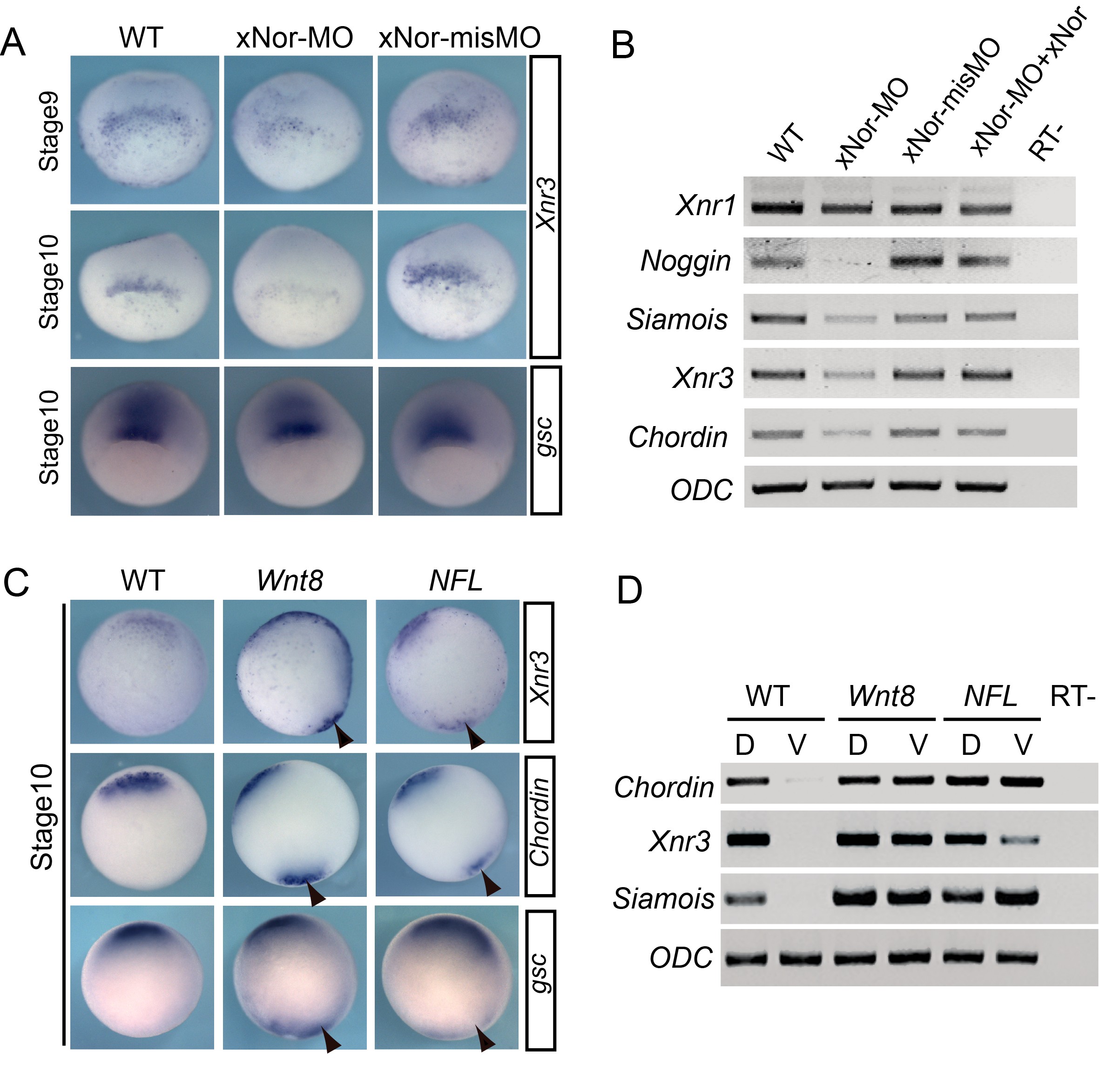 Figure S4. xNorrin is essential for early dorsal-specific gene expression. (A) The injection of xNor-MO reduced Xnr3 (stage 9: 70% reduced, n = 17; stage 10: 70% reduced, n = 20) but not gsc (14% reduced, n = 22) expression, as assayed by whole-mount in situ hybridization. (B) RT-PCR analysis showed that xNor-MO injected into dorsal animal cells reduced the expression of early dorsal-specific genes in stage 9 embryos. This reduction could be rescued by the injection of xNorrin mRNA (50 pg) lacking the xNor-MO target sequence. Note that xNor-MO did not change Xnr1 expression. ODC served as a loading control. (C) The overexpression of NFL in ventral vegetal blastomeres induced Wnt target gene expression. Upon injection into the ventral blastomeres of early eight-cell embryos, both NFL and Wnt8 induced Xnr3 (NFL: 56%, n = 25; Wnt8: 83%, n = 46) and Chordin (NFL: 72%, n = 29; Wnt8: 88%, n = 60) expression. However, NFL only weakly induced the Spemann organizer marker gsc (NFL: 7%, n = 28; Wnt8: 84%, n = 50). All embryos are in vegetal views. Arrowheads indicate the injection sites. (D) RT-PCR results (not quantitative) showed that NFL injection into ventral-vegetal cells ectopically activated Wnt target genes (Chordin, Siamois, and Xnr3) at the ventral side of the embryos. ODC served as a loading control. |