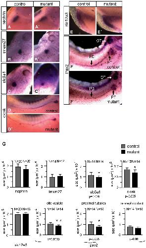 Figure 4. Analysis of nephron segment marker gene expression in larvae overexpressing P328L329del HNF1b mutation. Whole mount in situ hybridization of non-transgenic controls (A) and mutant animals (A99) heat-shocked at early gastrula stage were performed for the indicated marker genes. A00: Quantitation of the marker gene expression domains in mutant and control animals. * = p,0.01 (Student t-test). N refers to the number of measurements performed.