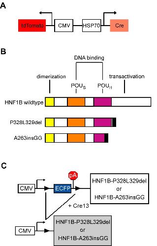 Cre activator and effector strains for the overexpression of HNF1β mutants. A: Scheme of the construct present in the HSPCre13 activator strain. Located on the same plasmid, Cre recombinase is under the control of the HSP70 promotor, whereas expression of the tdTomato reporter gene is driven by the CMV promotor. B: Domain structure of HNF1β and its mutant derivatives P328L329del and A263insGG. POUS and POUH refer to the POU specific domain and POU homeodomain, respectively. C: Scheme of the transgenic effector constructs used in the present study. The CMV-driven blue fluorescent protein ECFP is used as a reporter. It is flanked by loxP sites (black triangles) followed by the open reading frame of HNF1β harboring either the P328L329del mutations (328del4 strain) or the A263insGG mutation (A263ins6 strain). Successful recombination of the effector construct upon HSPCre13 activation leads to the expression of either P328L329del or A263insGG. The effector strains contain in addition a FRT site, which is not shown here [20].