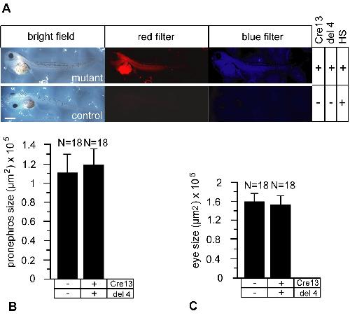 Effects of tailbud-stage overexpression of P328L329del HNF1β mutation on larval development. Representative larvae of crossings between heterozygous HSPCre13 males and heterozygous 328del4 females. The F1 offspring were heat-shocked for two hours at 34 at tailbud stage (st. 25). A: Comparison of a larva with overexpressing the P328L329del HNF1β mutation with a non-transgenic control. Red fluorescence: HSPCre13 transgene. Blue fluorescence: 328del4 transgene. C and D: Quantitation of the average pronephric kidney (C) and eye sizes (D) in mutant and control animals. * = p<0.01 (Student's t-test). N refers to the number of single pronephri or eyes that were measured. Scale bar = 1 mm.