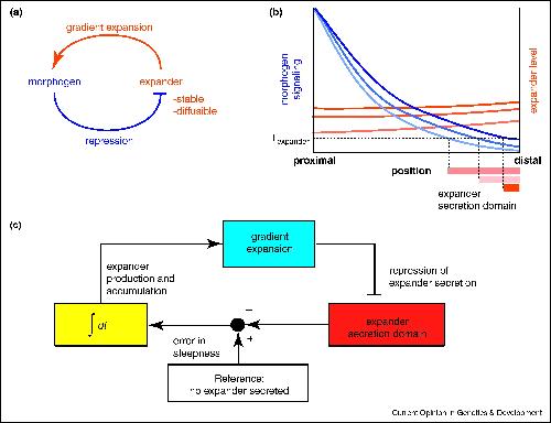 Figure 3. The Expansion–Repression mechanism. (a) The Expansion–Repression feedback topology. The morphogen (blue) represses the secretion of an expander (orange). The expander, which is diffusible and stable, expands the morphogen gradient. (b) Expansion of the morphogen gradient (pale to bright blue) leads to the gradual restriction of the expander secretion domain towards the distal region of the morphogenic field (pale to bright orange bars). Texpander is the threshold for expander secretion repression. The gradient continues to expand until the expander is repressed in almost the entire field. The expander accumulates during the expansion of the gradient (pale to bright orange), such that larger fields will require higher levels of the expander. (c) An integral feedback lies at the heart of the Expansion–Repression mechanism. Expander secretion (red) is compared to the reference, no secretion of the expander (white). The error, which is the expander-secretion domain, translates into expander secretion and accumulation over time (yellow). Increase in expander levels leads to gradient expansion (blue), which results in restriction of the expander-secretion domain. The control circuit stabilizes when the error is zero, that is, when the expander is not secreted.