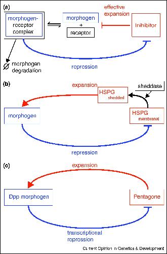 (a) A morphogen inhibitor can function as an expander: when degradation of the morphogen is mediated by interaction with its receptor, inhibition of the morphogen binding to the receptor decreases the morphogen degradation rate. Therefore, the inhibitor is effectively an expander.