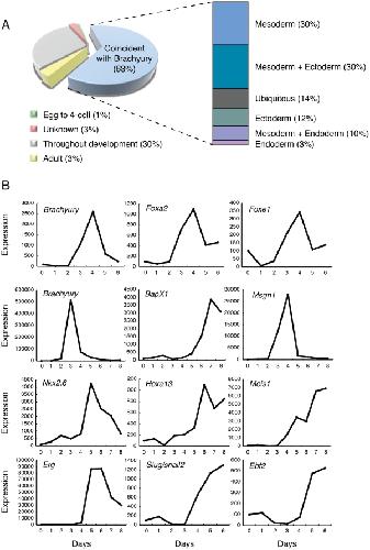 Figure 2. Analysis of Brachyury targets.(A) Pie chart showing the times in development at which Brachyury target gene expression begins in the mouse embryo (as a percentage of total; nâ=â396). Most genes (63%) start to be expressed between E7.5, when Brachyury is expressed in the primitive streak, notochord and tailbud, and E17.5, when expression is restricted to trunk mesenchyme. Of targets showing this temporal expression pattern, 30% are restricted to mesodermal derivatives, as indicated in the bar chart to the right. Others are expressed in various combinations of ectoderm, mesoderm and endoderm. (B) Temporal expression of transcription factor targets of Brachyury during ES cell differentiation in spinner culture, obtained by RT-PCR. The three panels in the top row were taken from a batch of cells in which Brachyury expression peaked at day 4 of culture; the rest were taken from a batch in which Brachyury expression peaked at day 3. All show means of triplicate measurements and are normalised to levels of beta actin. Foxa2 and Foxe1 in the top row peak with Brachyury at day 4; genes in the lower panel peak later than Brachyury. |