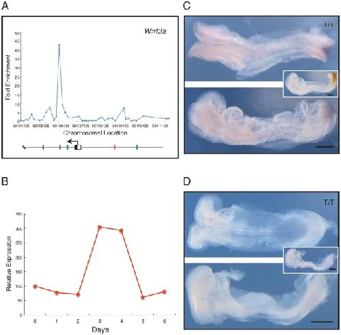 Figure 4. Analysis of Wnt3a, a positive regulator of the Wnt pathway.(A) Location analysis of Wnt3a. The figure (and Figs. 5, 6) shows fold enrichment against chromosomal position. Plot is the mean of triplicate chip results, aligned to the mm8 Feb. 2006 assembly. Blue bars represent the T box-like site TSACANNT (N = any base, S = G/C); green bars represent (AC)n; red bars the consensus TCACACCT. Stars above bars represent sequence on reverse strand. (B) Quantitative RT-PCR expression profile for Wnt3a during ES cell differentiation, expressed relative to beta actin. (C, D) Expression of Wnt3a studied by in situ hybridisation; in each, the top image shows a dorsal view, and the bottom image a lateral view. (C) Phenotypically wild type (+/+ or +/T) embryo at E8.5–8.75, and (D) a mutant (T/T) embryo from crosses of Brachyury heterozygous mutant mice. Wnt3a expression is detected with NBT/BCIP (purple) and the insets show a lateral view after double staining for Brachyury detected with INT/BCIP (orange brown). Note that in the wild type embryo Wnt3a is expressed in tailbud and paraxial mesoderm. In the mutant embryo expression of Wnt3a staining is absent or greatly reduced (n = 3). Scale bars indicate 250 µm. |