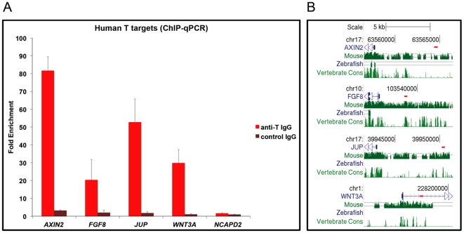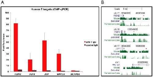Figure 7. Conservation of BRACHYURY binding in the human genome.(A) ChIP-qPCR performed on samples from differentiated hECSs using a specific anti-BRACHYURY IgG and a non-specific control IgG. Graph shows enrichment for regulatory regions of Brachyury targets (AXIN2, FGF8, JUP, WNT3A) and a negative control region (NCAPD2). Results are expressed relative to input chromatin divided by the enrichment for the non-specific control antibody. (B) BRACHYURY binding in the human genome. The short red lines below the chromosomal coordinates (hg19) depict the position of the PCR amplicons relative to the beginning of the human genes (blue). The three bottom tracks show the genome sequence conservation between human and mouse, zebrafish and vertebrate genomes (Genome Browser, http://genome.ucsc.edu/). |