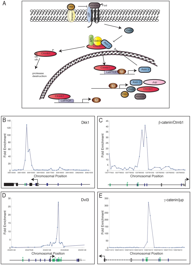 Figure 3. Components of the Wnt pathway as Brachyury targets.(A) The Wnt signalling pathway. Arrows indicate positive interactions and bars represent negative interactions. Targets identified in this study are outlined in bold. (BâE) Brachyury binding in genomic regions around Dkk1 (B); Ctnnb1/β-catenin (C); Dvl3 (D); and γ-Catenin/jup/plakoglobin (E). Each target shows fold enrichment against chromosomal position. Blue bars represent the T box-like site TSACANNT (Nâ=âany base, Sâ=âG/C) and green bars represent (AC)n. Stars above bars represent sequence on the reverse strand. Plots are average of triplicate chip results, aligned to the mm8 Feb. 2006 assembly. |