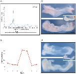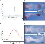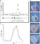Figure 5. Analysis of Axin2, a negative regulator of the Wnt pathway.(A) Location analysis of Axin2. For details see legend to Fig. 4. (B) Quantitative RT-PCR expression profile for Axin2 during ES cell differentiation, expressed relative to beta actin. (C, D) Expression of Axin2 studied by in situ hybridisation; in each, the top image shows a dorsal view, and the bottom image a lateral view. (C) Phenotypically wild type (+/+ or +/T) embryo at E8.5â8.75 and (D) a mutant (T/T) embryo, both derived from crosses of Brachyury heterozygous mutant mice. Axin2 expression is detected with NBT/BCIP (purple) and the insets show a lateral view after double staining for Brachyury detected with INT/BCIP (orange brown). Note that in the wild type embryo Axin2 is expressed in tailbud, paraxial mesoderm and lateral margin of the neural folds. In the mutant embryo expression of Axin2 is greatly reduced (nâ=â9). Scale bars are 250 µm. |