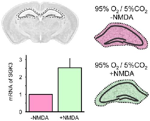 Figure 1. SGK3 mRNA expression in hippocampus after pharmacological NMDA receptor stimulation.mRNA levels of SGK3 before and after incubation of hippocampal slices with 10 µM NMDA for 30 minutes, determined by quantitative RT-PCR. The expression data from hippocampus were normalized to the expression of the housekeeping gene β-actin. The quantitative RT-PCR revealed a 2.5±0,52 fold increase in SGK3 mRNA in NMDA-treated compared to non-treated hippocampal slices. Number of experiments n = 4.