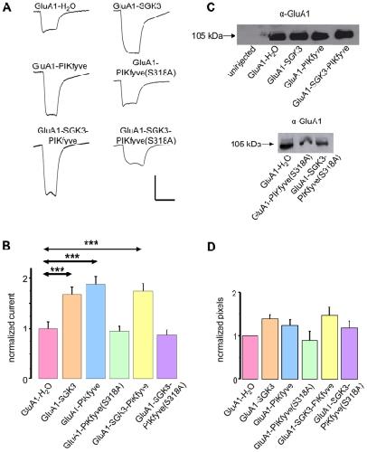 Figure 3. GluA1 function is increased by SGK3 and PIKfyve.(A) Representative current traces measured in Xenopus oocytes in response to superfusion with 300 µM glutamate plus 100 µM cyclo-thiacide. All currents were measured at −70 mV. Vertical scale-bar, 0,5 µA; horizontal bar, 4 s. (B) GluA1 current amplitudes in oocytes expressing GluA1, or combinations of GluA1 with SGK3, the inactive form of PIKfyve (PIKfyve(S318A)), or wild type PIKfyve. Numbers of oocytes are n = 20–30. Significant changes (p<0.001) are indicated by *** (p = 0.00049; 0.00036; 0.000073, respectively). (C) Representative samples including controls from uninjected oocytes were biotinylated to isolate plasma membrane GluA1, then separated on an SDS gel, Western-blotted and probed with a primary rabbit anti-GluA1 antibody. The GluA1 protein has an apparent molecular weight of ∼105 kDa. (D) Bar graph showing relative abundance of GluA1 plasma membrane protein. The band intensity was quantified by densitometric analysis using the software Scion image.