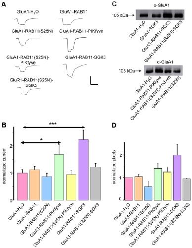 Figure 4. Regulation of GluA1 by SGK3 and PIKfyve is Rab11-dependent.(A) Representative current traces measured in Xenopus oocytes in response to superfusion with 300 µM glutamate plus 100 µM cyclo-thiacide. All currents were measured at −70 mV. Vertical scale-bar, 0,5 µA; horizontal bar, 4 s. (B) GluA1 current amplitudes in oocytes expressing GluA1, or combinations of GluA1 with Rab11, the dominant negative form of Rab11 (Rab11DN), PIKfyve, or SGK3. Numbers of oocytes are n = 15–30. Significant changes (p<0.001, p<0.05) are indicated by *** (p = 0.00015) and * (p = 0.036), respectively. (C) Representative samples including controls from uninjected oocytes were biotinylated to isolate plasma membrane GluA1, then separated on an SDS gel, Western-blotted and probed with a primary rabbit anti-GluA1 antibody. The GluA1 protein has an apparent molecular weight of ∼105 kDa. (D) Bar graph showing relative abundance of GluA1 plasma membrane protein. The band intensity was quantified by densitometric analysis using the software Scion image.