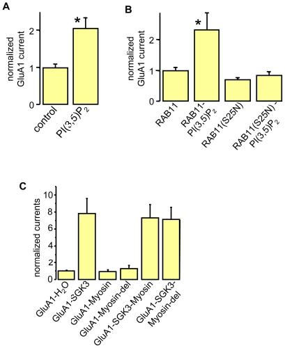 Figure 5. The SGK3-dependent trafficking of GluA1 proteins requires functional RAB11 and the generation of PI(3,5)P2, but is myosin-independent.(A) GluA1 current amplitudes in oocytes before and after acute injection of a water-soluble analog of PI(3,5)P2. Significant change (p<0.05) is indicated by * (p = 0.0015). (B) GluA1 current amplitudes in oocytes expressing GluA1 or combinations of GluA1 with Rab11 or the dominant negative form of Rab11 (Rab11DN), before and after acute injection of a water-soluble analog of PI (3,5)P2. Numbers of oocytes are n = 7–28. Significant change (p<0.05) is indicated by * (p = 0.025). (C) GluA1 current amplitudes in oocytes expressing GluA1 or combinations of GluA1 with SGK3, myosin Vb, or the mutated form of myosin Vb (myosin del). Number of oocytes are n = 14–28.