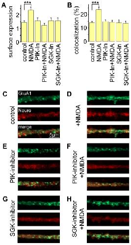 Figure 6. Reduced GluA1 expression after treatment with an SGK inhibitor or a PIKfyve inhibitor.(A, B) Statistical analysis of GluA1 surface expression and colocalization of GluA1 with neuroligin revealed increased surface and synaptic GluA1 expression after treatment with NMDA. This effect is abolished by SGK or PIKfyve inhibition. Control = untreated, NMDA = incubated with NMDA, PIK-In = treated with PIKfyve inhibitor, SGK-In = treated with SGK inhibitor. (C–H) Representative confocal images of dendrites stained with GluA1 (green) and neuroligin (red –Neuro) in controls versus NMDA-treated neurons under different conditions: (C) control versus (D) NMDA, (E) PIKfyve inhibitor (PIK inhibitor), (F) PIKfyve inhibitor and NMDA (PIK inhibitor+NMDA), (G) SGK inhibitor (SGK inhibitor), (H) SGK inhibitor and NMDA (SGK inhibitor+NMDA). The magnification is equal for all images - scale bar indicates 5 µm. Number of images analyzed n = 10–15, obtained from independent neuron culture preparations.