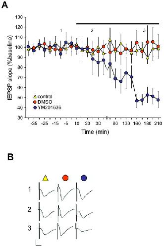 Figure 7. PIKfyve inhibition results in depression of hippocampal basal synaptic transmission.(A) Basal synaptic transmission was recorded in the CA1 region of hippocampal slices. Control (non-treated) hippocampi, or hippocampi treated with DMSO showed stable evoked responses throughout the 210 min recording period. Treatment with the PIKfyve inhibitor (YM201636) elicited a depression of evoked responses that became evident 40 min after drug application. Line-breaks indicate changes in time-scale. Black bar indicates DMSO or drug application. (B) Analog traces representing evoked potentials obtained in control slices or in slices in the presence of DMSO or YM201636, at the time-points indicated in the graph. Vertical scale-bar, 3 mV; horizontal bar, 3 ms.