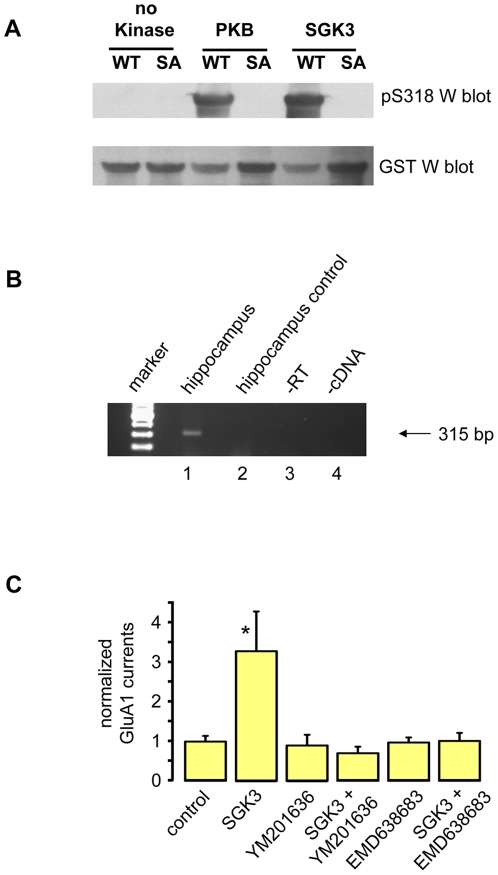 Figure 2. PIKfyve expression, phosphorylation, and function.(A) PIKfyve is phosphorylated at Ser318 by SGK3 and at Ser318 by PKB. Purified recombinant GST-tagged wild-type (WT) or S318A mutant (SA) of PIKfyve was subjected to Western blotting. Blots were incubated with rabbit anti-GST antibody (PIKfyve; lower panel), followed by stripping and reprobing with a rabbit anti-PIKfyve antibody specific for phosphoserine 318 (apS318; top panel). (B) RT-PCR demonstrating that PIKfyve is expressed in hippocampus. Lane 1: cDNA from hippocampus, the two primers bind in exons 19 and 20, respectively, and amplify a 315 bp fragment of PIKfyve; lane 2: control reaction to exclude genomic contamination; lane 3: control reaction without reverse transcriptase; lane 4: control reaction without cDNA. (C) The PIKfyve inhibitor YM201636 and SGK inhibitor EMD638683 suppress the upregulating effect of SGK3 on GluA1 currents. GluA1 current amplitudes in oocytes expressing GluA1. Acute injection of purified active SGK3 protein led to an increase in GluA1 currents. The effects of YM201636 and EMD638683 on GluA1 currents were measured in oocytes before and after acute injection of SGK3 protein. Significant change to GluA1 control (p = 0.013) is indicated by *. Numbers of oocytes were n = 7–36.