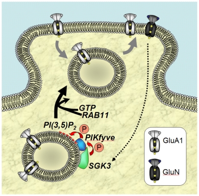 Figure 8. Postulated model of SGK3-dependent regulation of GluA1.Upon stimulation of NMDA receptors SGK3 is transcriptionally upregulated. SGK3 in turn phosphorylates/activates PIKfyve, which leads to local production of PI(3,5)P2 in PIKfyve-containing recycling vesicles. PI(3,5)P2 in turn stimulates Rab11-dependent plasma membrane-directed trafficking of GluA1-containing vesicles.