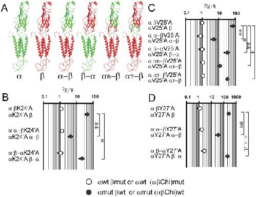 Figure 4. Effects of M2–M3 loop mutations on chimeric α1 β GlyR channel function.(A) The molecular identity of each chimera is schematically illustrated, with green and red denoting α1 and β subunit sequences, respectively. (B–D) The RM/Ws (the EC50 of the mutant chimeric α1 β GlyR divided by the EC50 of its relevant WT chimeric α1 β GlyR) resulting from introducing the K24′A, V25′A or Y27′A mutation. The symbol (○) represents constructs containing WT α1 and mutant β or other indicated chimeric subunit, while the symbol (•) represents constructs containing mutant α1 and WT β or other indicated chimeric subunit. (* p<0.05; ** p<0.01; n.s.d. not significantly different; using the Student's t-test).