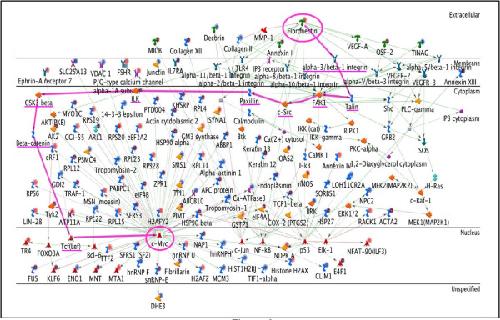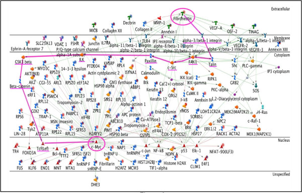 Figure 6. Fibronectin - c-Myc network. This network shows that multiple signaling pathways from FN can lead to the activation of c-Myc. The pathway highlighted in pink includes proteins involved in canonical Wnt signaling (GSK3beta, beta-catenin, and Tcf(Lef)).