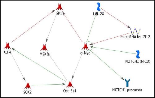 Figure 7. Stemness in limb regeneration. This network highlights the relationship of known stem cell markers (Oct3/4, Sox2, KLF4, Lin28) with TFs identified by this study (c-Myc and SP1) and previously identified TFs in limb regeneration (Msx1 and Notch1).