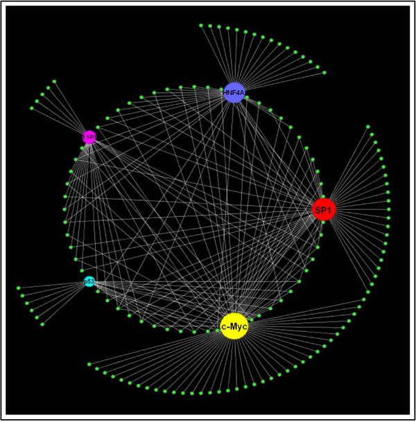 Figure 2. Transcription factor connectivity in axolotl proteomics data. The five most highly connected TFs (c-Myc, SP1, HNF4A, ESR1 and p53) and their downstream targets from the bait list proteins (represented by small green circles) are shown here. The size of the TF circle corresponds to its connectivity; a bigger circle entails higher overall connectivity. The targets in the outer circle are unique targets of each TF while those in the inner circle are shared by two or more TFs.