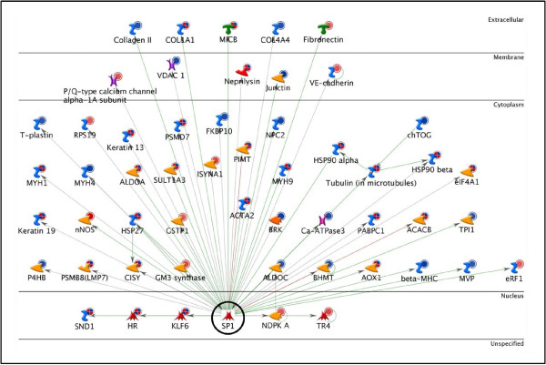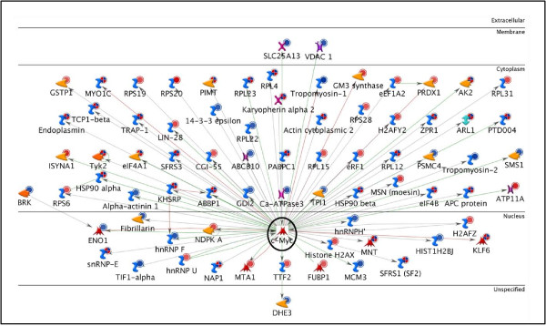 Figure 3. c-Myc Network. The network shows c-Myc (enclosed by a black circle) with its 71 targets from the bait list. The horizontal lines separate the proteins in the network into the following categories: extracellular, membrane, cytoplasm, nucleus, and unspecified. The various symbols used in the network have been described in detail in the supplementary information [Additional file 7].