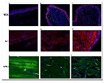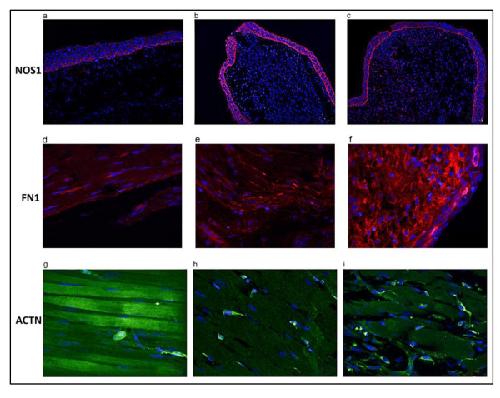 Figure 4. Immunostained sections of axolotl hindlimbs. Longitudinal sections of control (a, d, g) versus 1 day post amputation (dpa) (b, e, h) and 7 dpa (c, f, i) axolotl hindlimbs stained with primary antibodies to nitric oxide synthase 1 (NOS1) (a-c), fibronectin 1 (FN1) (d-f), α-actinin (ACTN) (g-i). Conjugated secondary antibodies were alexa-568 for fibronectin and NOS1, and alexa-488 for α-actinin. Nuclei were counterstained with 4',6-diamidino-2-phenylindole (DAPI). As expected from the proteomic data, fluorescence intensity of NOS1 showed a significant increase compared to control at 1 dpa, then decreased to a level slightly above control at 7 dpa. Fibronectin staining (red) at 1 and 7 dpa showed significant increases compared to controls, while α-actinin staining intensity (green) showed significant decreases. |