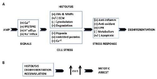 Figure 6. Summary diagram of regeneration processes. (a) Amputation generates signals that result in histolysis and liberation of cells from their tissue matrix. At the same time, these cells are under hypoxic and endoplasmic reticulum (ER) stress, and use a variety of mechanisms to counter this stress and prevent apoptosis, including upregulation of antiapoptotic pathways that protect cell membranes and nuclei. Some proapoptotic pathways are upregulated but are co-opted to remodel or eliminate internal cell structure. Along with changes in transcription factors, chromatin modifying enzymes, microRNAs and polycomb proteins, these mechanisms lead to dedifferentiation. (b) Throughout histolysis, dedifferentiation and accumulation of blastema cells under the wound epidermis, ecotropic viral integrative factor 5 (EVI5) is highly upregulated, preventing blastema cells from undergoing mitosis until after the accumulation blastema has formed. |