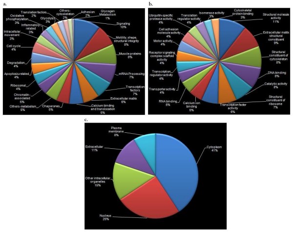 Figure 2. Functional and cellular categorization of proteins. Pie charts showing categories of 309 proteins according to (a) biological process, (b) molecular function, and (c) cellular location. Only the categories with at least five proteins have been included in the molecular function pie chart. Since a large number of categories were obtained from the Human Protein Reference Database (HPRD) for cellular localizations, they were classified into five major categories: cytoplasm (actin cytoskeleton, cytosol, and clathrin-coated vesicle), nucleus (centrosome, chromosome, and nucleolus), other intracellular organelles (ribosome, sarcoplasmic reticulum, sarcoplasm, mitochondrial matrix, mitochondrial membrane, mitochondrion, endoplasmic reticulum, golgi apparatus, lysosome and peroxisome), plasma membrane (integral to membrane) and extracellular (cell junction, extracellular matrix). |