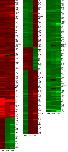 Figure 3. Global Expression intensity map. HeatMap showing upregulation (red) and downregulation (green) of priority 1 and 2 proteins identified as having significant fold changes relative to control. Numbers at bottom of each column indicate days post amputation (dpa). Left column: proteins upregulated on all dpa, or 1 dpa. Middle column: proteins downregulated on 1 and 4 dpa, and upregulated at 7 dpa; proteins upregulated at 1 and 4 dpa and downregulated at 7 dpa; and proteins downregulated at 1 dpa and upregulated at 4 and 7 dpa. Right column: proteins downregulated on all dpa or two of three dpa. Color intensity reflects fold change. |