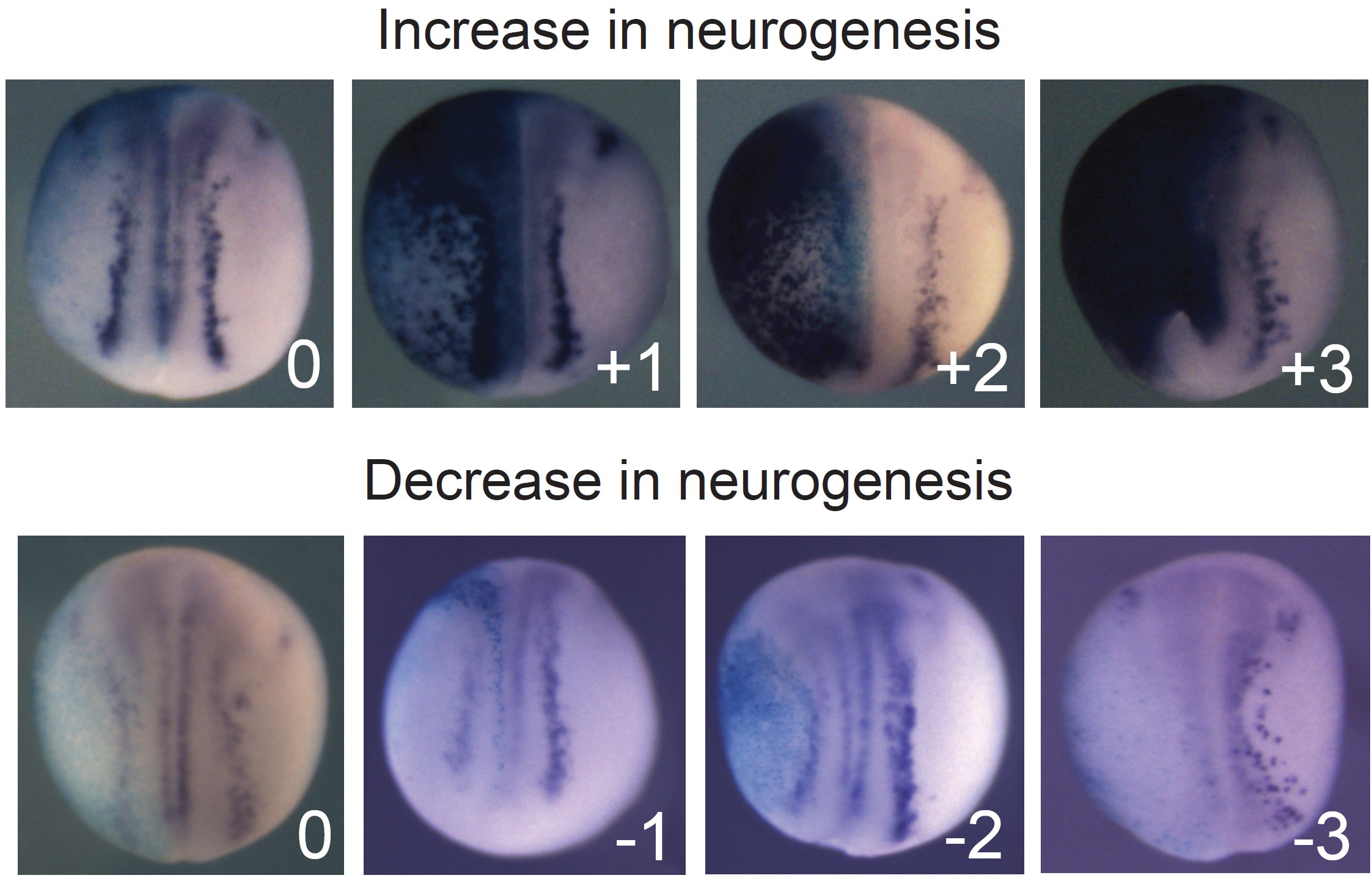 Fig. S2. Examples of the embryo scoring system used in Fig. 3. Semi-quantitative criteria were used to compare neural β-tubulin expression following in situ hybridization on the injected side and the uninjected side, and assigning a score of: 0, no difference; +1, slight increase in neurogenesis within the neural plate on the injected side; +2, significant increase in neurogenesis with ectopic expression of neural β-tubulin on the injected side; +3, very large increase in neurogenesis with ectopic expression of neural β-tubulin on the injected side; â1, slight decrease in endogenous neurogenesis on the injected side; â2, substantial decrease in endogenous neurogenesis on the injected side; or â3, no neurons on the injected side.