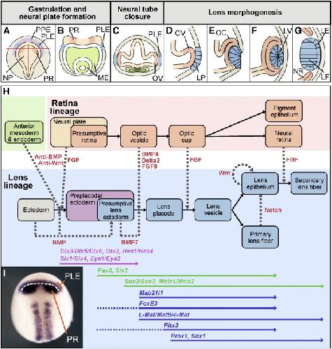 Fig. 1. Schematic illustration of vertebrate lens development, relationships between inductive interactions and sequential activation of transcription factors. (AâG) Xenopus was chosen as the vertebrate representative since its developmental lineages of lens, retina and other related tissues have been well studied ( [Eagleson and Harris, 1990] and [Eagleson et al., 1995]). The developmental stages are indicated at the top of the figure. (A) Dorsal view of a neural plate-stage embryo (anterior at the top of the image) indicating the preplacodal ectoderm (PPE, purple), the presumptive lensectoderm (PLE, dotted light blue), the neural plate (NP, light orange), and the presumptive retina field (PR, dark orange). (B) Transverse section of a neural plate-stage embryo through the PLE and PR. The red line in A indicates the plane of the section. Lens and retina lineages are shown in light blue and dark orange, respectively, in B-G, and mesoderm and endoderm (ME) are shown in light green. (C) Transverse section of a neural tube-stage embryo where the optic vesicle (OV), which develops from the PR, reaches the PLE. (D-F) Close-ups showing lens vesicle formation. The PLE overlying the OV becomes thickened to form the lens placode (LP), which subsequently separates from the headectoderm to form the lens vesicle (LV). OC, optic cup. (G) Close-up of a maturating lens. LE, lensepithelium; LF, lens fiber; NR, neural retina. (H) Major signaling factors are indicated in red with dotted gray arrows. FGF signaling from the neural retina is responsible for the formation of the secondary lens fibers from the lensepithelium (Lovicu and McAvoy, 2005). The other signaling pathways are explained in the text. At the bottom, Expression profiles of preplacodal genes, lens-specification genes and lens-differentiation genes (pink, green, and blue arrows, respectively) studied in Xenopus, zebrafish, chicken and mouse embryos. The dotted blue lines of FoxE3 and Pitx3 represent species differences in initial expression profiles. Details and references are described in the text. (I) In situ hybridization analysis of Pax6 expression in a neural plate-stage Xenopus embryo (dorsal view). The PLE and PR are indicated. The boundary between the neural plate and PPE is indicated by a white broken line. Note that preplacodal Pax6 expression occurs broadly adjacent to the anterior margin of the neural plate.