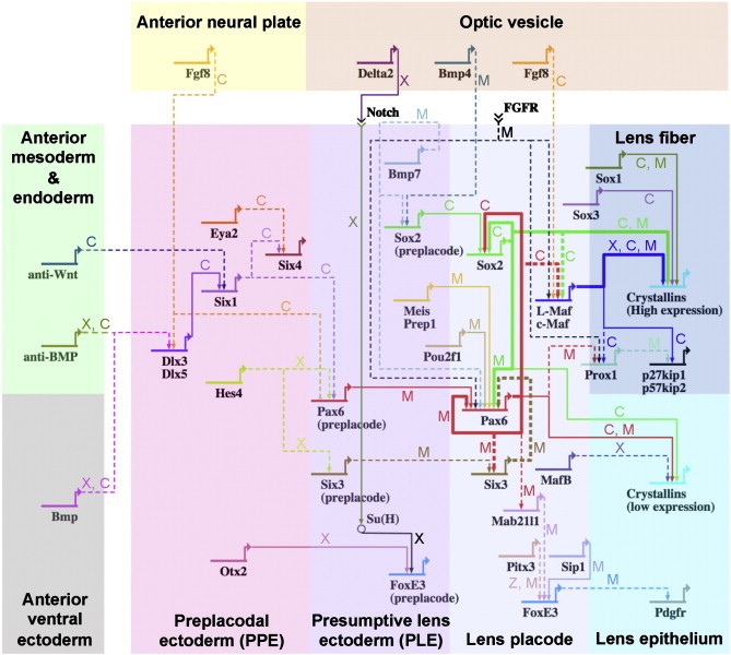 Fig. 2. Genetic pathways for the induction of lens differentiation from the PPE. The pathways were deduced from gene interactions characterized in Xenopus, zebrafish, chicken and mouse, and depicted using BioTapestry (Longabaugh et al., 2005). Each gene is indicated by a short horizontal line that represents its cis-regulatory region and a bent arrow that represents its transcription start site. Solid lines connecting genes indicate direct gene interactions revealed by cis-regulatory analyses, and dashed lines connecting genes indicate gene interactions characterized by loss-of-function and/or gain-of-function experiments. Of the lines indicating gene interactions, those with an arrow at the end and those with a short horizontal line at the end indicate activation and repression of downstream genes, respectively. The bold lines highlight cross-regulatory interactions between Pax6, Sox2 and Six3, and feed-forward regulation involving Maf genes. Letters (X, Z, C, M) beside lines representing gene interactions indicate the model animals (Xenopus, zebrafish, chicken, and mouse) in which the interaction was identified, respectively. The funnel-like symbols and open circle indicate receptors and a downstream signal transducer, respectively. Tissues are identified using different background colors.