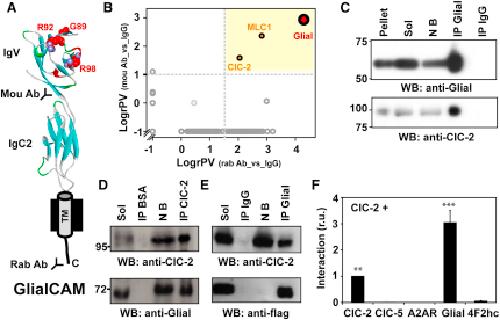 Figure 1. Identification of ClC-2 as a GlialCAM-Interacting Protein(A) Scheme of the GlialCAM molecule. Mutated residues studied in this work are depicted. Antibodies used for purification (mou: mouse; rab: rabbit) are shown.(B) Evaluation of GlialCAM affinity purification from mouse brain. The scheme shows a 2D plot of relative protein enrichment in affinity purifications versus IgG controls. Proteins specifically copurified are shown in the yellow area; dashed lines indicate the specificity thresholds as suggested by the distribution of all protein ratios (gray circles).(C), Immunoblot analysis of a sample of the affinity purification with the anti-GlialCAM rabbit polyclonal antibody stained with the same antibody (upper) and with anti-ClC-2 C1 antibody (lower); lanes resolve aliquots of pellet after solubilization, solubilizate (Sol), not bound (NB), or eluates from the purification (IP Glial). IP IgG: eluate from an IgG control.(D) Copurification of GlialCAM with anti-ClC-2 C2 antibody. Lanes were labeled as before.(E) Coimmunoprecipitation from HeLa cells transiently transfected with ClC-2 and Flag-tagged GlialCAM. Lanes were labeled as before.(F) Quantification of interaction using the split-TEV assay. ClC-2 was tested for interaction with the proteins indicated below the graph. ∗∗p < 0.01; ∗∗∗p < 0.001 versus 4F2hc.See also Figure S1.