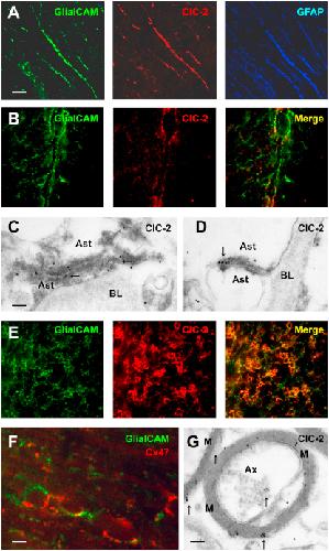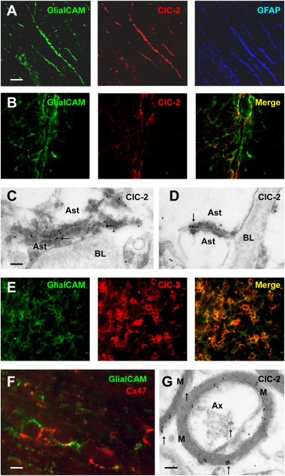 Figure 2. Localization of ClC-2 and GlialCAM in the BrainMouse brain sections labeled with antibodies against GlialCAM, ClC-2, or GFAP antibodies. (A) cerebellar Bergmann glia; (B) astrocytic endfeet surrounding blood vessels in cortex; (C and D) EM immunolabeling of human cerebellum shows localization of ClC-2 (arrows) in astrocyte-astrocyte junctions near basal lamina; (E) oligodendrocytic cell bodies in myelinated fibers of cerebellar white matter tracts.(F) Coexpression of GlialCAM and the oligodendrocyte marker Cx47 in membranes of oligodendrocytic bodies in the cerebellum.(G) EM immunolabeling detects ClC-2 in myelin (arrows).Scale bars for (A), (B), and (E) 20 μm; (F) 5 μm; for panels (C) and (D) 200 nm; (G) 500 nm. M: myelin; Ax: axon; Ast: astrocyte; BL: basal lamina. ClC-2 antibodies used: C1 (A); C2 (B–F). See also Figure S2.