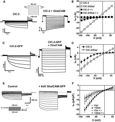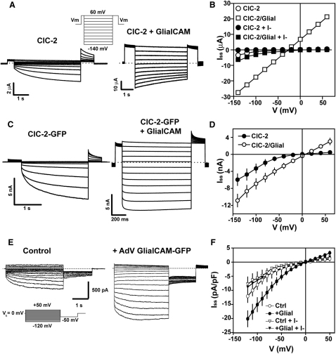 Figure 4. GlialCAM Modifies ClC-2 Currents in Xenopus Oocytes, HEK Cells, and Primary Rat Astrocytes(A) Currents mediated by ClC-2 (left) expressed in oocytes and after coexpression of ClC-2 with GlialCAM (right).(B) Representative steady-state current-voltage relationship of ClC-2 (circles) and ClC-2 coexpressed with GlialCAM (squares) in chloride (open symbols) or iodide (filled symbols). Average initial currents measured at +60 mV were 0.96 ± 0.17 μA (n = 14) for ClC-2 and 17.2 ± 2.2 μA (n = 10) for ClC-2/GlialCAM.(C) Typical whole-cell currents from transfected HEK293 cells with ClC-2-GFP alone (left) or together with GlialCAM (right). The GFP tag does not affect ClC-2 current properties.(D) Average steady-state current voltage from ClC-2-GFP (filled circles) or ClC-2-GFP/GlialCAM (circles) transfected HEK293 cells.(E) Left: representative trace of whole-cell inwardly rectifying chloride currents in dbcAMP-treated cultured neocortical rat astrocytes. These currents, as described (Ferroni et al., 1997), were blocked when chloride was replaced by iodide (F) and were not blocked by tamoxifen (data not shown). Right: representative trace of chloride currents of dbcAMP-treated astrocytes transduced with adenoviruses expressing GlialCAM fused to GFP. The inset shows the voltage protocol used.(F) Average steady-state current-voltage relationship of dbcAMP-treated astrocytes (circles, n = 14) or transduced with adenoviruses expressing GlialCAM-GFP (filled circles, n = 14) in chloride medium. Recordings were performed in symmetrical chloride concentrations. In some recordings chloride was exchanged by iodide (triangles or filled triangles). At hyperpolarizing voltages iodide block was by 32.7% ± 3.2% for control astrocytes (n = 6) and by 56.8% ± 2.9% for astrocytes transduced with adenoviruses expressing GlialCAM-GFP (n = 8).See also Figure S4.