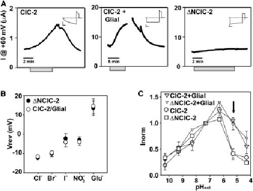 Figure 6. Electrophysiological Characterization of the GlialCAM/ClC-2 Complex(A) Dependence on the extracellular osmolarity of ClC-2, ClC-2 + GlialCAM, or ΔNClC-2 currents. Gray bars indicate application of the hypotonic solution. Insets show typical responses of the same oocytes to a pulse to −140 mV before swelling.(B) Reversal potential of ΔNClC-2 (n = 5 ± SEM) and ClC-2/GlialCAM (n = 5 ± SEM) currents under different anionic conditions.(C) pH dependence of ClC-2 and ΔNClC-2, each without and with GlialCAM. Currents were normalized to the value at pH 7.3. Arrow points to the pH value with the largest difference between the groups that express or not GlialCAM.See also Figure S5.