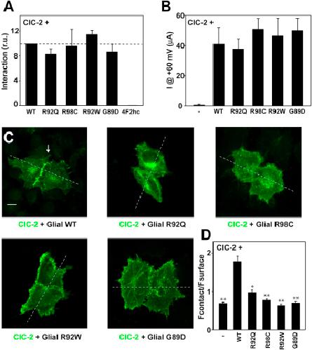 Figure 7. Biochemical and Functional Consequences of GLIALCAM Mutations on ClC-2(A) Interaction between ClC-2 and GlialCAM or GlialCAM containing MLC-related mutations revealed by split-TEV interaction assays (n = 5).(B) Average instantaneous currents at +60 mV from ClC-2 expressing oocytes coinjected with saturating concentrations of GlialCAM or the indicated GlialCAM variants. The result is an average of n = 5 in each experiment from three independent experiments.(C) Immunofluorescence of HeLa cells expressing ClC-2 plus wild-type GlialCAM or GlialCAM containing the MLC-related mutations R92Q, R98C, R92W, and G89D. Scale bar: 10 μm. Expression at contact sites and non-contact surface membrane was determined by the analysis of the intensity profile along the dashed line.(D) Relative fluorescence intensity at cell contacts. Intensity profile analysis revealed that ClC-2 alone had a ratio R of fluorescence Fcontact/Fsurface (see Experimental Procedures) of 0.7 ± 0.03 (n = 58), ClC-2 + GlialCAM a value of 1.8 ± 0.14 (n = 55), and the GlialCAM variants studied (with at least 24 pair of cells analyzed) had R values less than 1 (see Experimental Procedures), indicating that the variants containing MLC-related mutations were not able to cluster ClC-2 to cell junctions. ∗p < 0.05, ∗∗p < 0.01 versus wild-type GlialCAM plus ClC-2. Similar results were observed in HEK cells (not shown).See also Figure S6.
